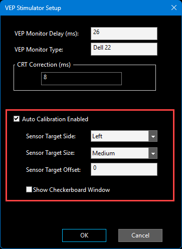 VEP Checks – new Auto Calibration mode that uses the calibration sensor during data acquisition for improved accuracy in determining the timing of pattern reversal. This mode doesn’t require separate calibration of the monitor delay. The new mode works with both Windows 11 and 10. To use this mode the calibration sensor must remain on the VEP monitor for the duration of the VEP data acquisition, and must be positioned over a sensor target area on either the left or right side of the monitor.